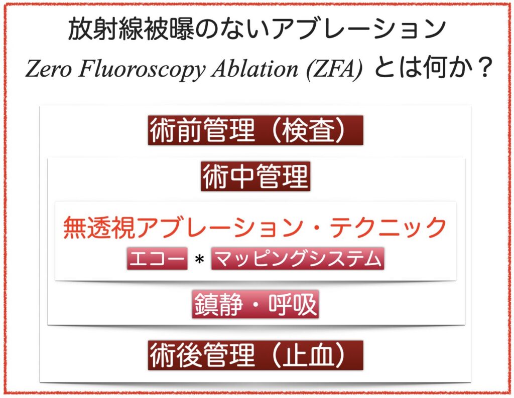 放射線被ばくのないアブレーション(ZFA)は、カテーテルアブレーションに関連した放射線被ばくをALARAの原則に則り必要最小限する術前・術中・術後の管理を包括したコンセプトです。