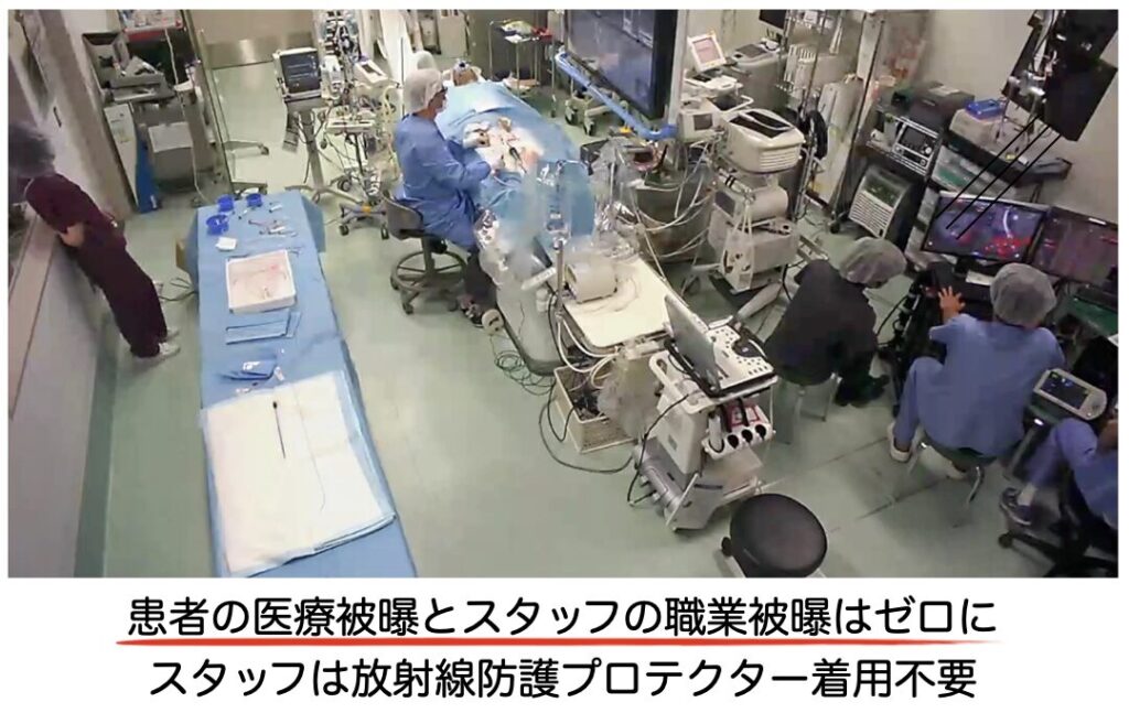 放射線被ばくのないアブレーションの実際ですが、カテ室のスタッフは放射線防護プロテクターの着用が不要になります。EP Labo のスタッフの職業被ばくをなくすことができることはアブレーションを受ける患者さんだけでなくスタッフの安全も確保できる点で EP Laboの目指すべきゴールの一つに挙げられています。放射線被ばくのないアブレーションは海外では普及しつつあり、今後国内でも選択するべき手技として定着していくものと予測されます。